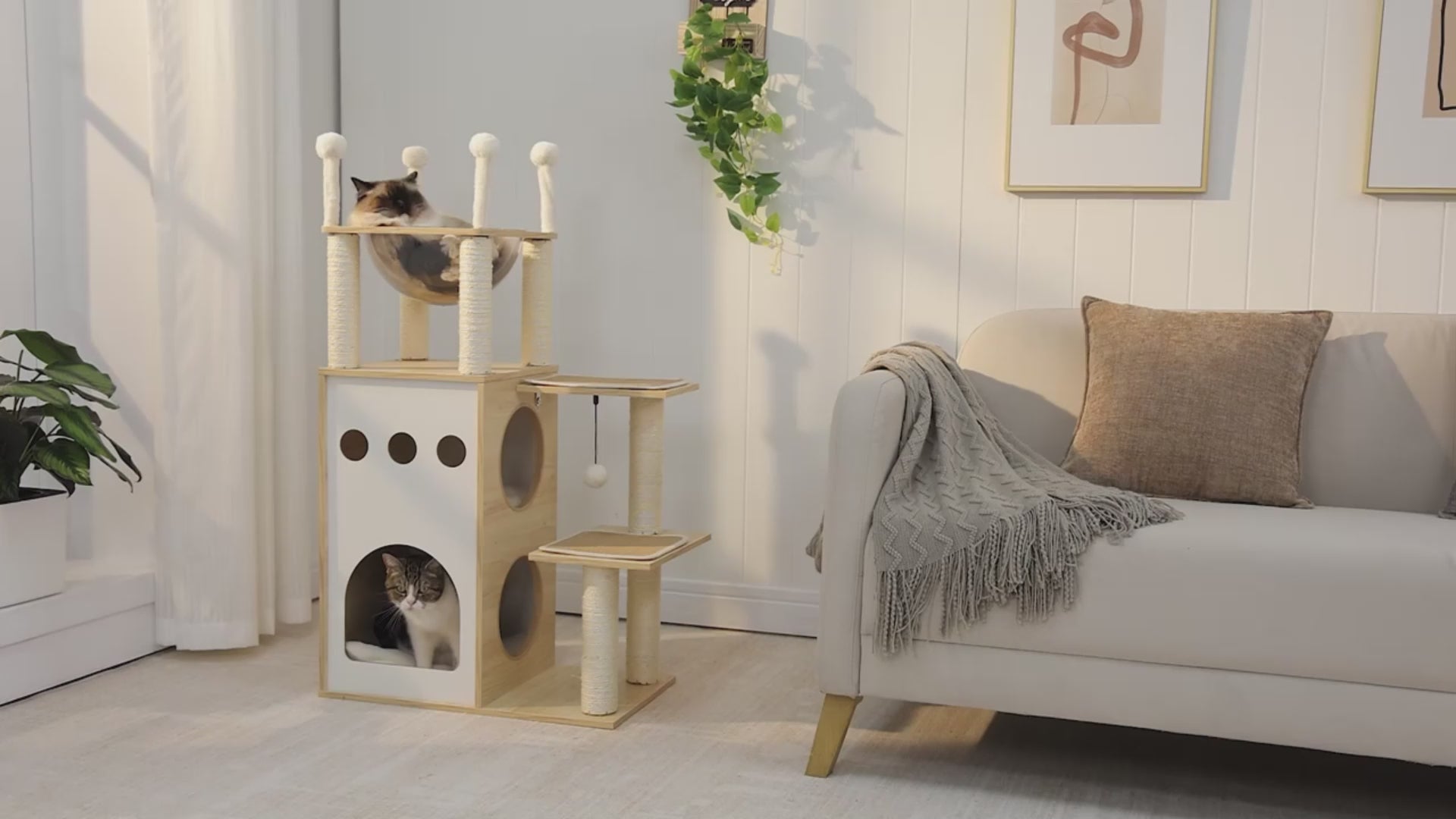 Chez MiaouTown, nous utilisons uniquement des matériaux robustes, sûrs et durables : bois massif ou MDF renforcé, sisal naturel pour les poteaux à griffer, tissus doux et résistants. Aucun produit toxique n’est utilisé.