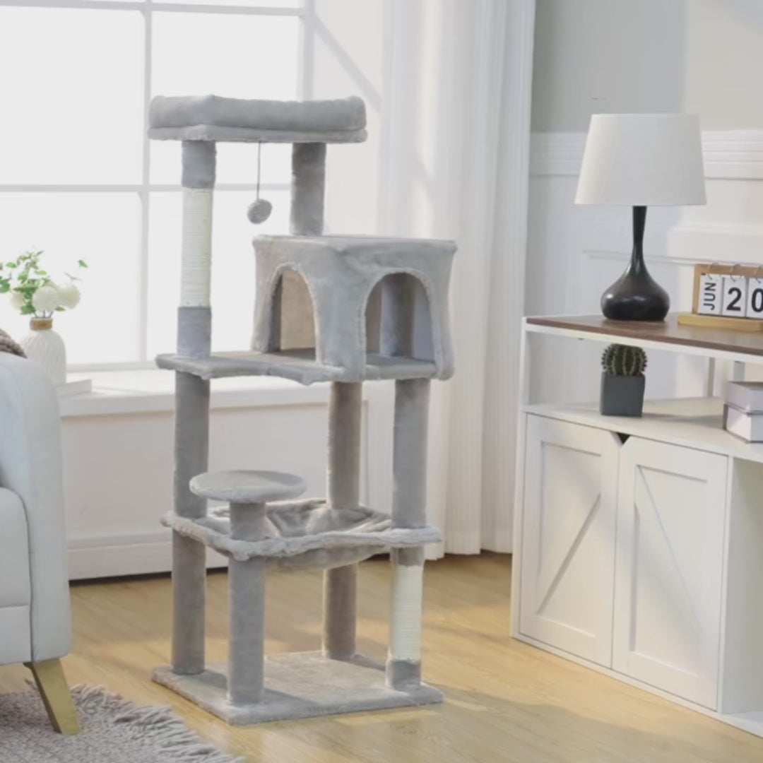 Arbre à chat conçu pour créer un espace de jeu et de repos adapté aux chats. Sa structure à plusieurs niveaux encourage l’activité physique, tandis que la cabane intégrée constitue un lieu pour se détendre. Les différents étages permettent aux chats d’explorer, grimper et observer leur environnement intérieur.