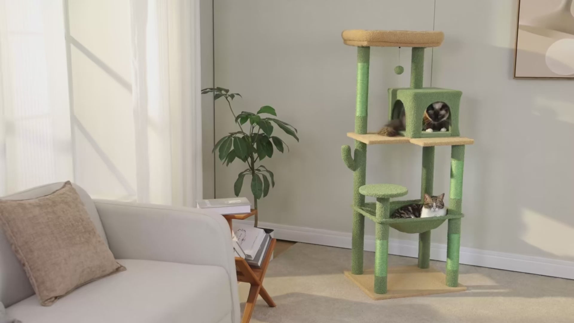 Arbre à chat en forme de cactus pensé pour créer un espace de jeu, de repos et de griffade. Sa structure à plusieurs niveaux permet aux chats de grimper, d’observer leur environnement et de se détendre. La partie abritée constitue un lieu calme pour le repos, tandis que les plateformes supérieures encouragent l’activité du chat.
