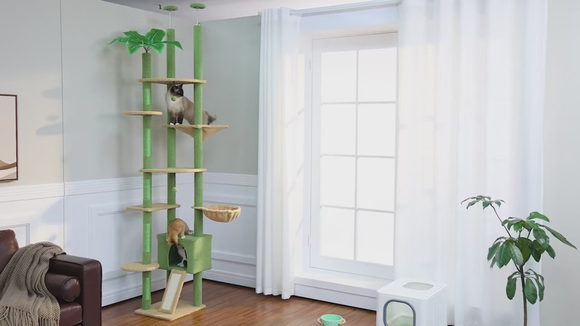 Arbre à chat de grande hauteur conçu pour créer un espace d’escalade, de repos et d’observation pour les chats. Sa structure modulable propose plusieurs niveaux accessibles et se stabilise grâce à la fixation entre le sol et le plafond. Les différents étages et le hamac en hauteur constituent des zones de jeu pour les chats.
