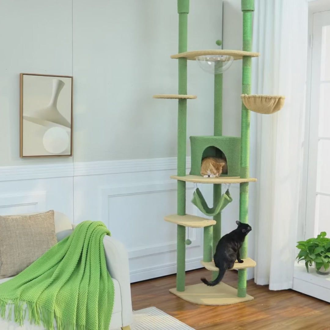 Arbre à chat de grande taille conçu pour créer un espace complet de jeu, de grimpe et de repos. Sa structure réglable se fixe entre le sol et le plafond. Les différents niveaux, marches et zones de repos permettent aux chats de se déplacer, d’explorer et d’observer leur environnement.