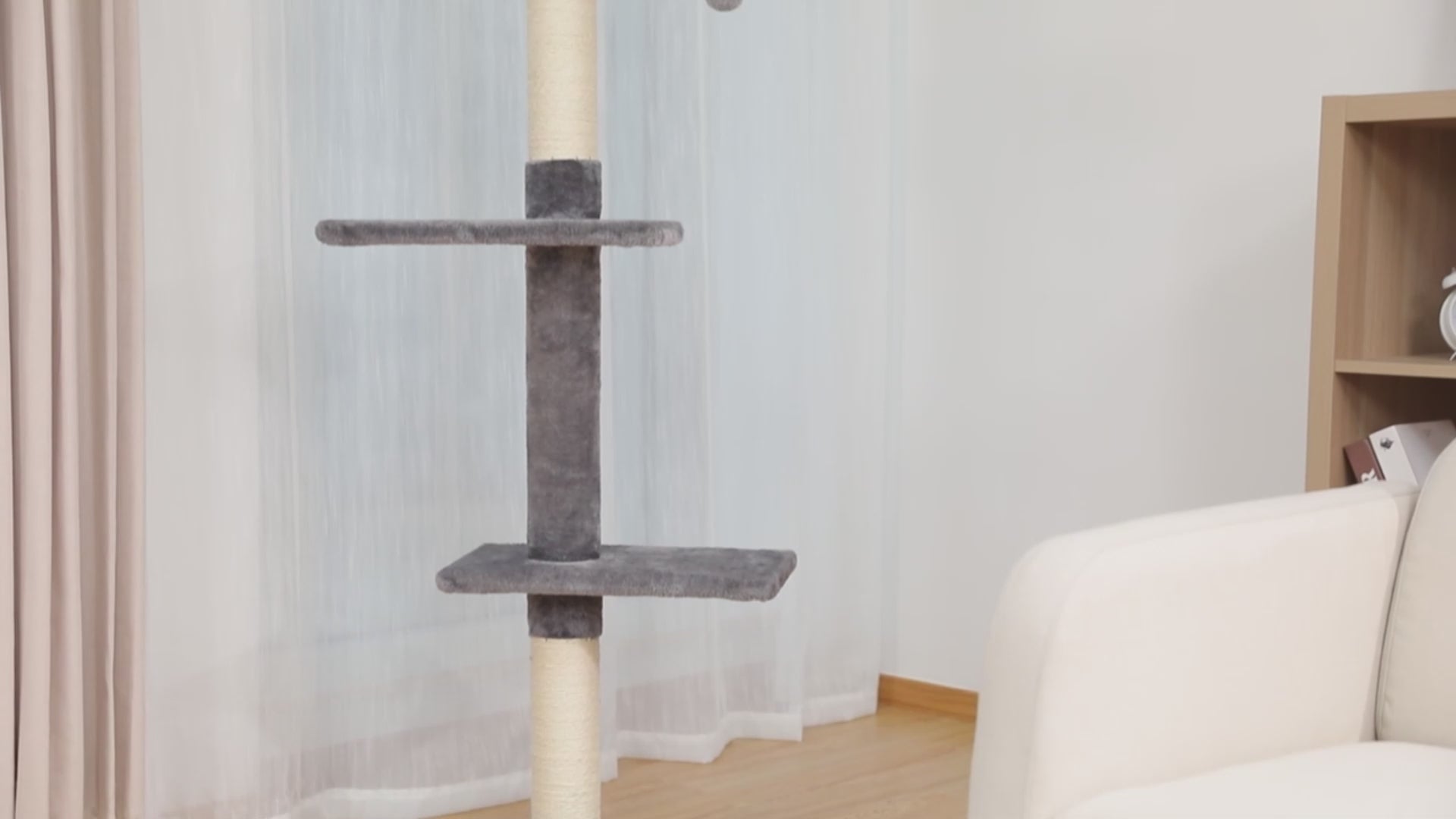 Arbre à chat de grande taille conçu pour créer un espace de grimpe, de jeu et de repos. Sa structure modulable se règle entre le sol et le plafond pour plus de stabilité. Les différents niveaux, associés aux zones de repos et aux grattoirs intégrés, permettent aux chats de se déplacer et de se divertir, notamment dans les espaces avec de hauts plafonds.